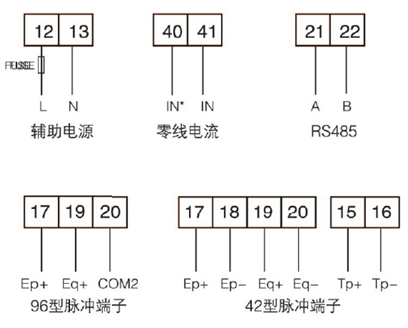 ● 電源端子、零線電流信號端子、RS485通訊端子、脈沖輸出端子