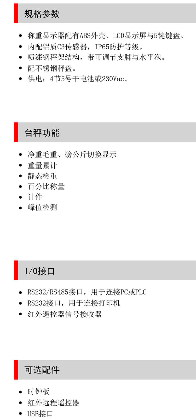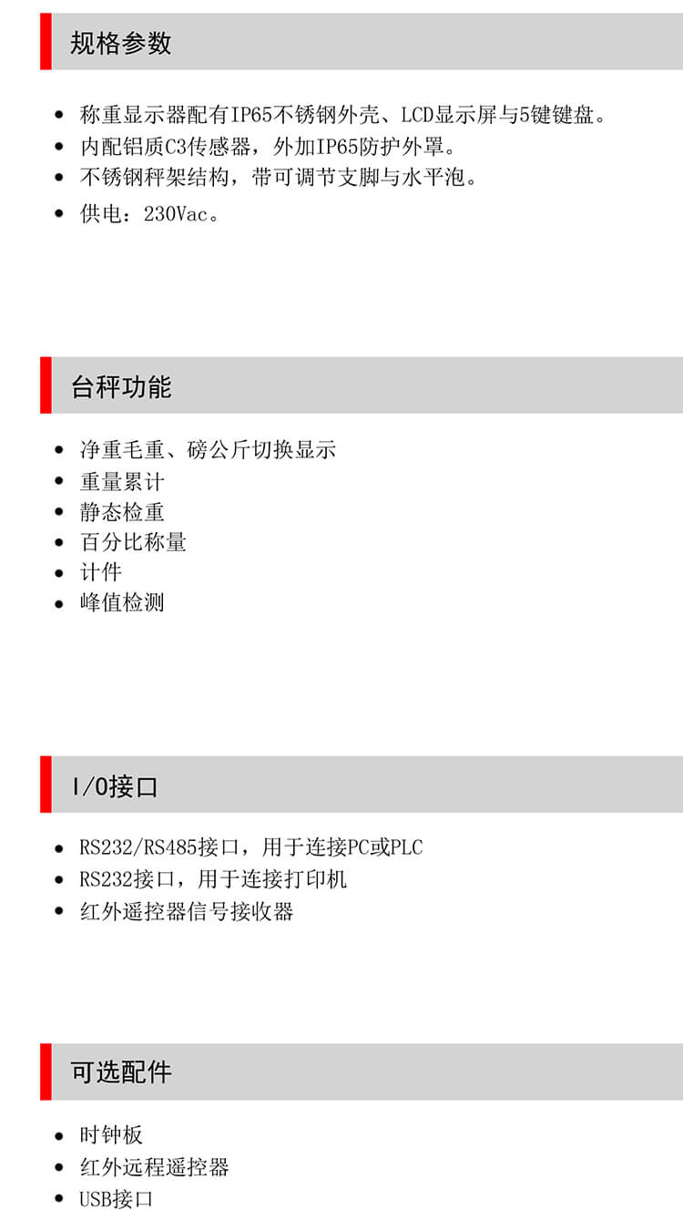 稱重顯示器配有ABS外殼、LCD顯示屏與5鍵鍵盤。